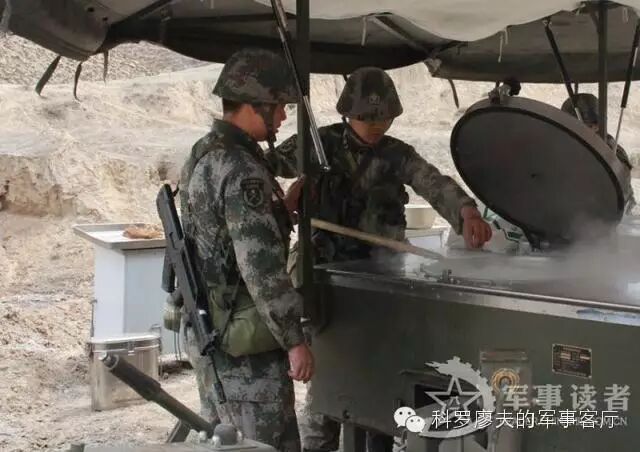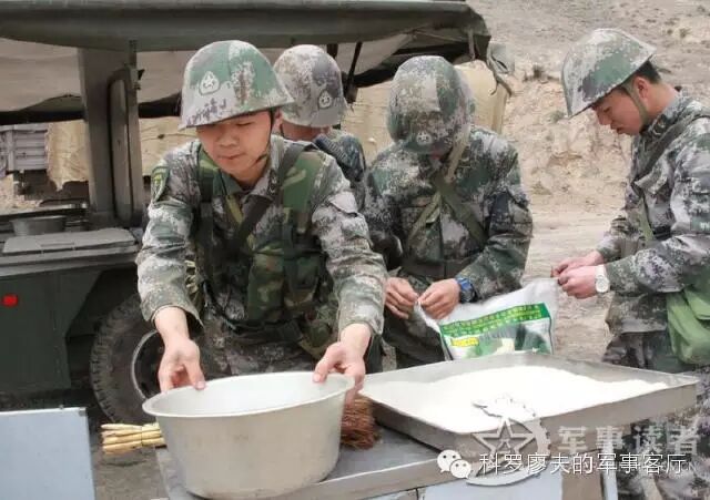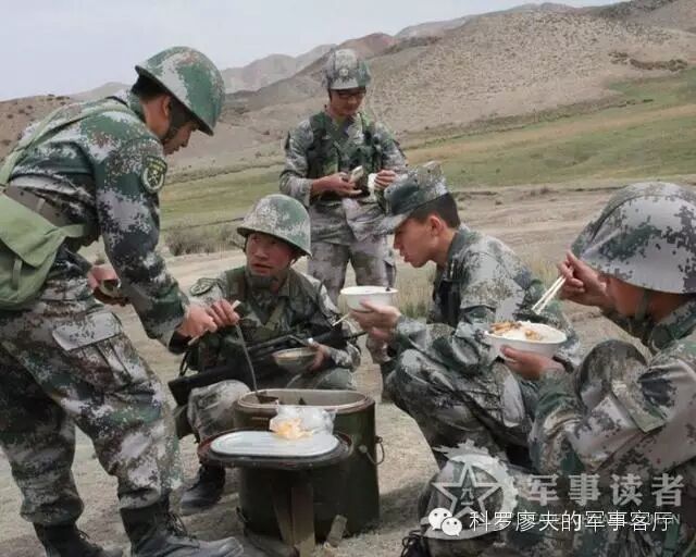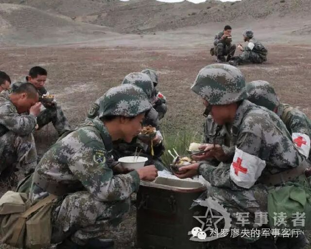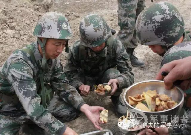 例如上图是正在执行野外驻训任务的新疆军区步兵四师高炮团,该团配发有野战炊事车,以连队为单元实施伙食保障,图片里那种制式保温式的“饭桶”,可以保障一个步兵班的野外热食,相对于开挖无烟灶和塑料饭桶,这是个巨大的进步。但是再看看官兵吃的食物,以及不锈钢饭碗和一次性发泡餐盒,都显得相当随意,完全没形成制式化。这说明我军野战军的野外伙食,近几年虽有进步,但总体上还处于比较低级阶段。从伙食制备,到餐饮形式,再到餐具设备,很多都是临时性和部队自发行为。
