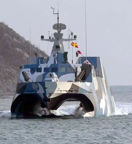 022型导弹艇采用的双体小水面线穿浪艇型,适航性能优异,能够有效在5级海况作战,这样就提供了其伴随大舰作战的可能。中国海军未正式公布国022型艇的航速指标,但可以从同类船型指标中找到答案,SBI公司的穿浪双体船AMD/K55型为50节,AMD/A60型为60节,在5级海况下也可以保持高速航行,所以推测022艇拥有50节的最高航速。
