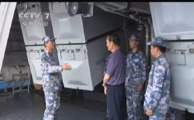 图片:022型隐身导弹艇的弹仓内部图,听讲解的老者是我军“八六海战”的著名战斗英雄麦贤德。