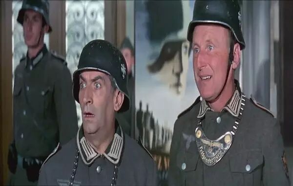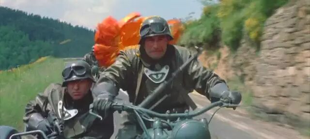 “啦啦啦……嗯~~”(法国油漆匠奥古斯特站架子上悠闲的粉刷着墙壁,英国空军皮特从天而降,落在了架子的上头。架子下面,德国军官恰好刚刚下车,情况真是紧急)