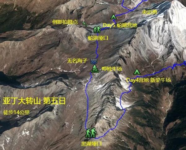 徒步14公里,海拔累计上升650米,下降450米;蛇湖营地海拔4480米,想拍摄倒影和日落的朋友建议选择湖尾营地,角度更好。