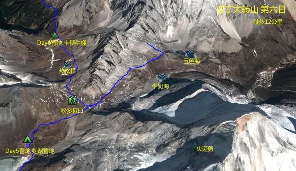 D5:营地—热松措—松多垭口(4680米)—蛇湖—牛奶海—五色海—诺绒牛场—冲古寺—珍珠海—亚丁—稻城(3900米)