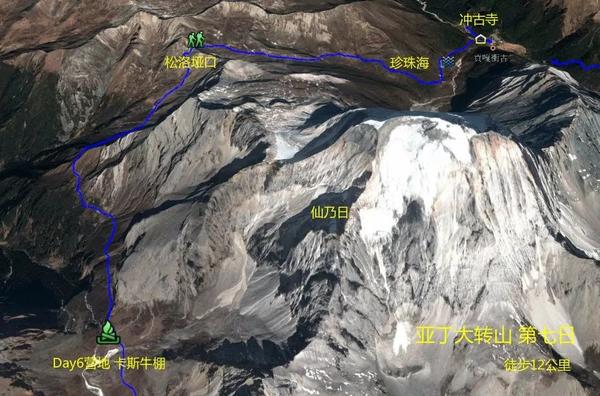 本路线环绕亚丁三神山外围360度,刚好切合圆满转山的心意。实际上线路结合了传统洛克线和从木里水洛乡嘎洛村出发,经嘎洛牛场和波拥措、巴玉营地到达冲古寺的徒步线路,从轨迹来看,跟“大转便捷道”差不多。
