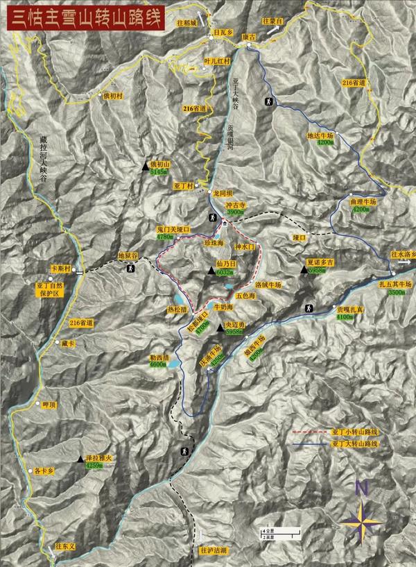 https://pic4.zhimg.com/v2-7c1689c13d21496be5c9442e4e7ad157_b.jpg转山线路分为大转完全道(图中蓝线)、大转便捷道(图中蓝线与黑色虚线组成的环线)、仙乃日小转路线(图中红线)。