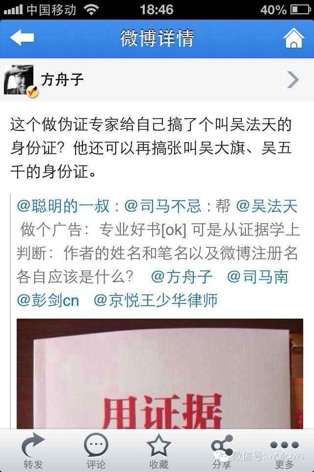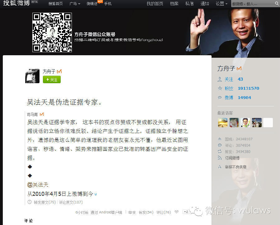 从大旗事件后,方舟子的一些铁杆粉丝跑来支持我,被他打入“前方粉”阵营。那个依据事实说话的方舟子到哪里去了?我当时很诚恳地说,“希望你不要成为你自己反对的人”。司马南转发我的微博时说我是证据学专家,我当然不敢如此自称,但方舟子转发司马南的微博后直接说:“吴法天是伪造证据专家”,后来又再次对我诽谤。