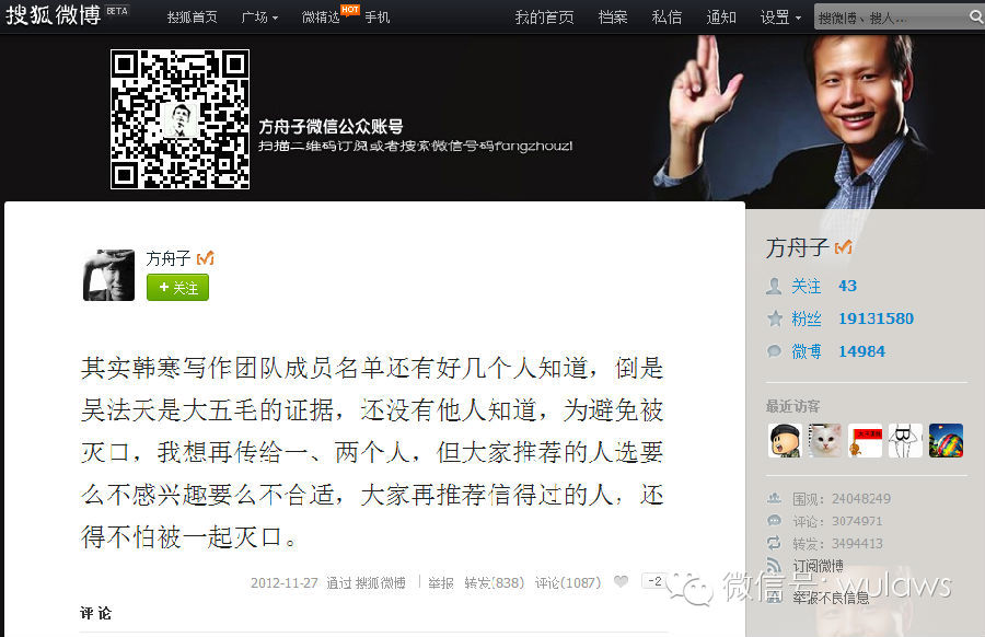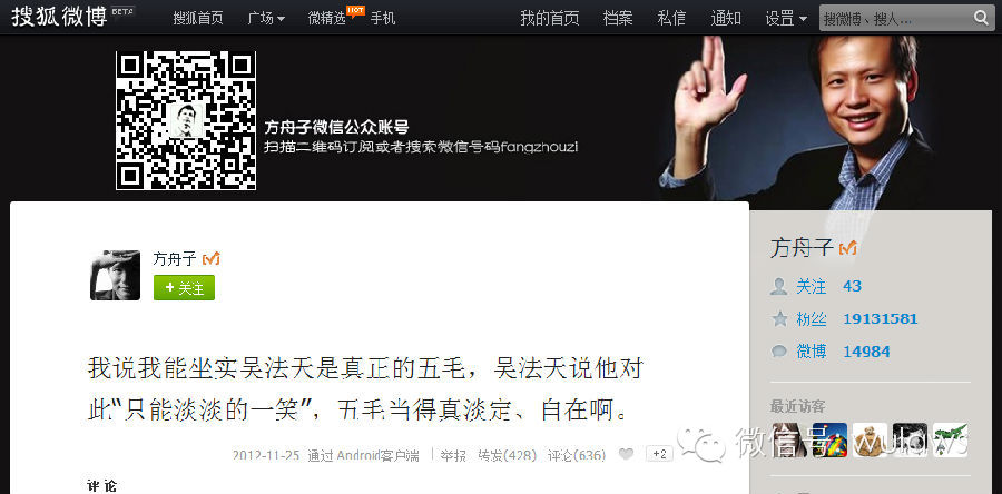 朋友说,方舟子又在搜狐微博隔空骂你了。我都不记得是多少次了,这方先生可能一直对“大旗之争”的败绩耿耿于怀,隔三差五恶心我。我早已删除了搜狐微博,所以不得不麻烦好事的朋友截屏给我看。原来,方舟子因为我的新书书名《用证据说话》,在那里毫无证据地骂我“伪造证据”呢。我绞尽脑汁想半天也不记得伪造过教主或者教主夫人任何证据啊,这完全有悖方先生自诩的言必有据的传统啊。薛蛮子忠告的上面两段话,我真的建议方先生平心静气地读一读,不要成为下一个薛蛮子。
