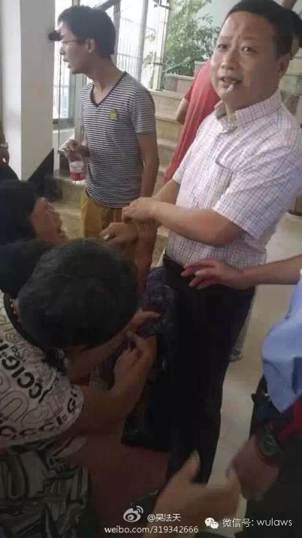 7月14日晚上,我在微信朋友圈发现一组照片,貌似一些村民被警察带走的现场,有一张照片特别醒目,几位妇女和老人跪在一位领导模样的人前面苦苦哀求,而站立者叼着香烟,居然笑容满面。