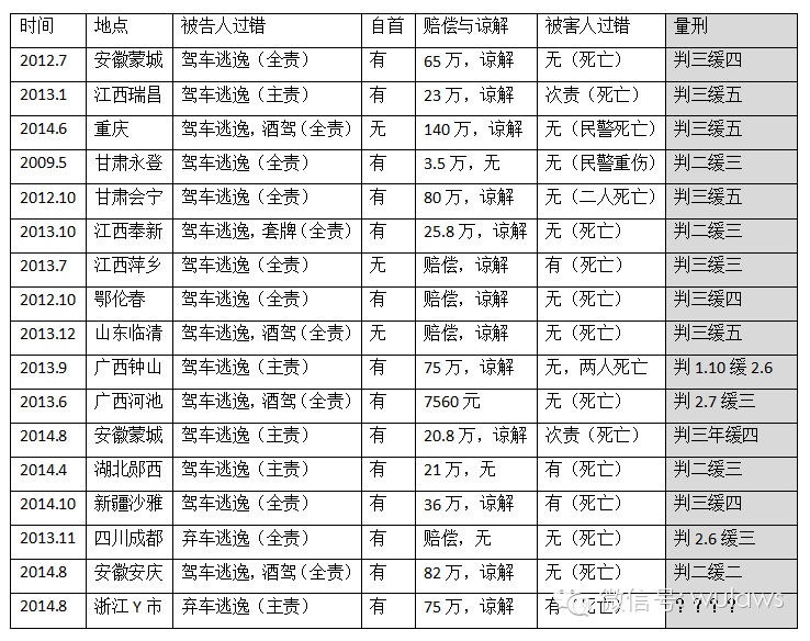 我收集了一下最近这些年交通肇事逃逸后自首后的量刑情况,几乎全国各地都有大量判缓刑的情况,而且很多情节都比王某案要重。比如有的肇事司机是全责(王某是主责),有的是撞死两人,有的赔偿没有这么多,有的被害人无过错,有的家属没有谅解……但这些案件的被告人都判了缓刑。就说重庆这起交通肇事案件,撞死的是警察,而且是酒后驾车,逃逸后又没有自首,就因为赔偿谅解,判了缓刑。下面这张表格,或许能更直观清楚地看到交通肇事逃逸后自首的量刑基本情况。那么,王某可以判缓刑吗?
