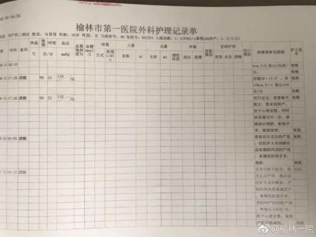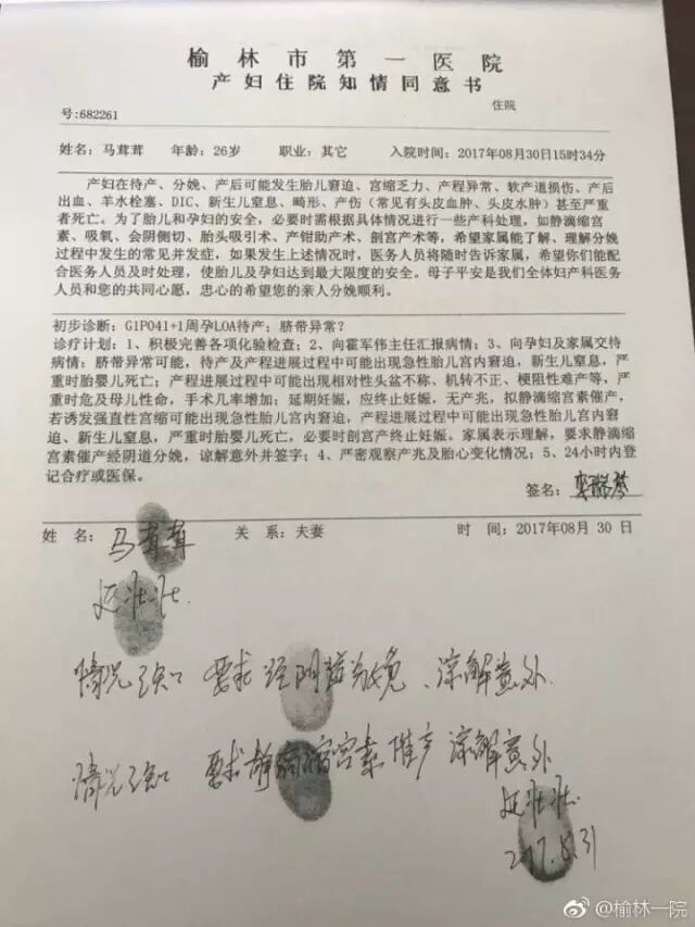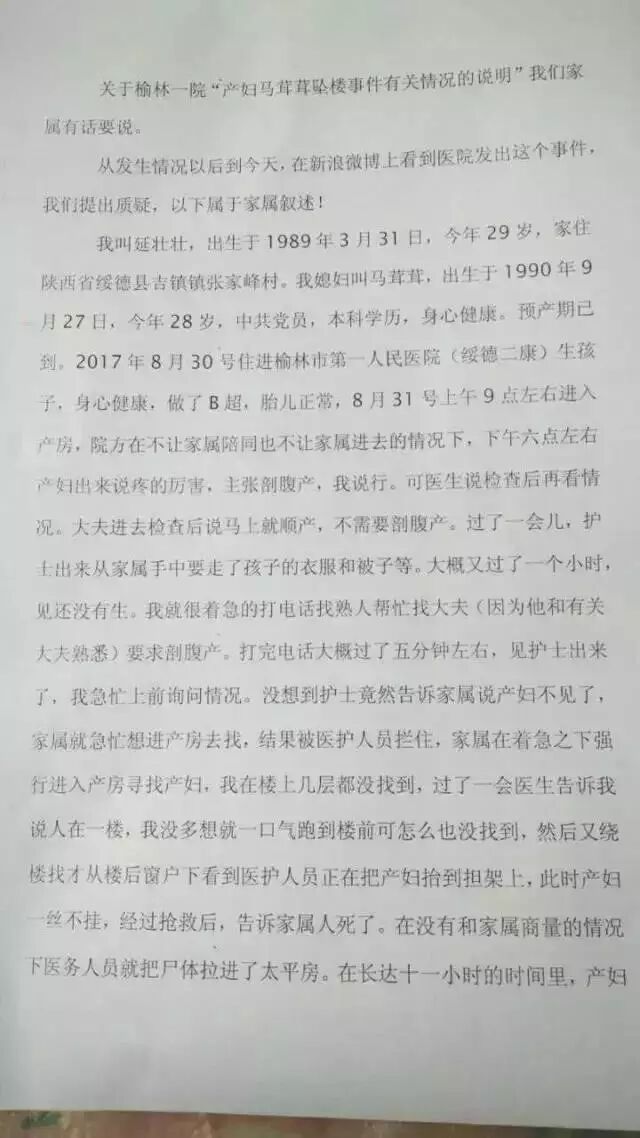 2017年8月31日20时左右,陕西榆林市第一医院绥德院区住院部5楼,一名26岁的待产孕妇从楼上坠下身亡。医院发表声明称,产妇马某于入院待产后,经检查发现胎儿头部偏大,阴道分娩难产风险比较大。医护人员就向产妇、家属说明情况,并建议剖腹产,然而家属坚持顺产,并在《产妇住院知情同意书》上签字。产妇多次向医护人员提出剖腹产的要求,医护人员征求家属意见时,家属一直不愿意,坚持顺产。后产妇跳楼自杀,一尸两命。