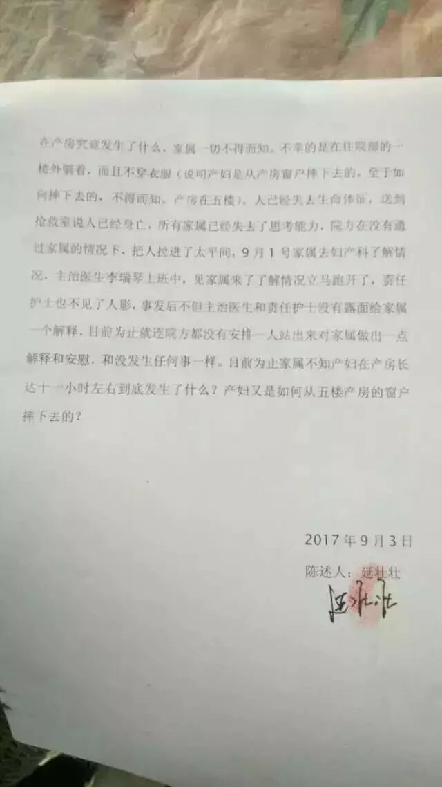 但是事发后,家属在网上又说当时同意了。孕妇的丈夫延先生说,“她出来喊疼的这两次,我都主动跟医生说,她疼的话咱们就剖腹产。但是医生回复说,检查后产妇一切正常,快要生了,不用剖腹产。”延先生向记者表示,“做剖腹产,我们不会不同意的。在这之后我也着急了,还打了一个电话给医院的朋友,让他找熟悉的医生做剖腹产。打完电话,护士出来就说我妻子人不见了。”延先生称,事发后,医院也没有出面给出任何的解释。“按照我妻子的性格,根本不会作出这种激烈的反应。”延先生堂哥也佐证了这种说法。