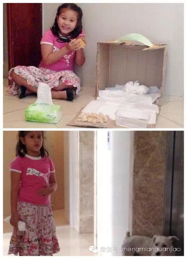 2、下午捡到一条无主狗,我们在楼道里给他放了水和食物,甄小美还给他精心建了一个“家”。