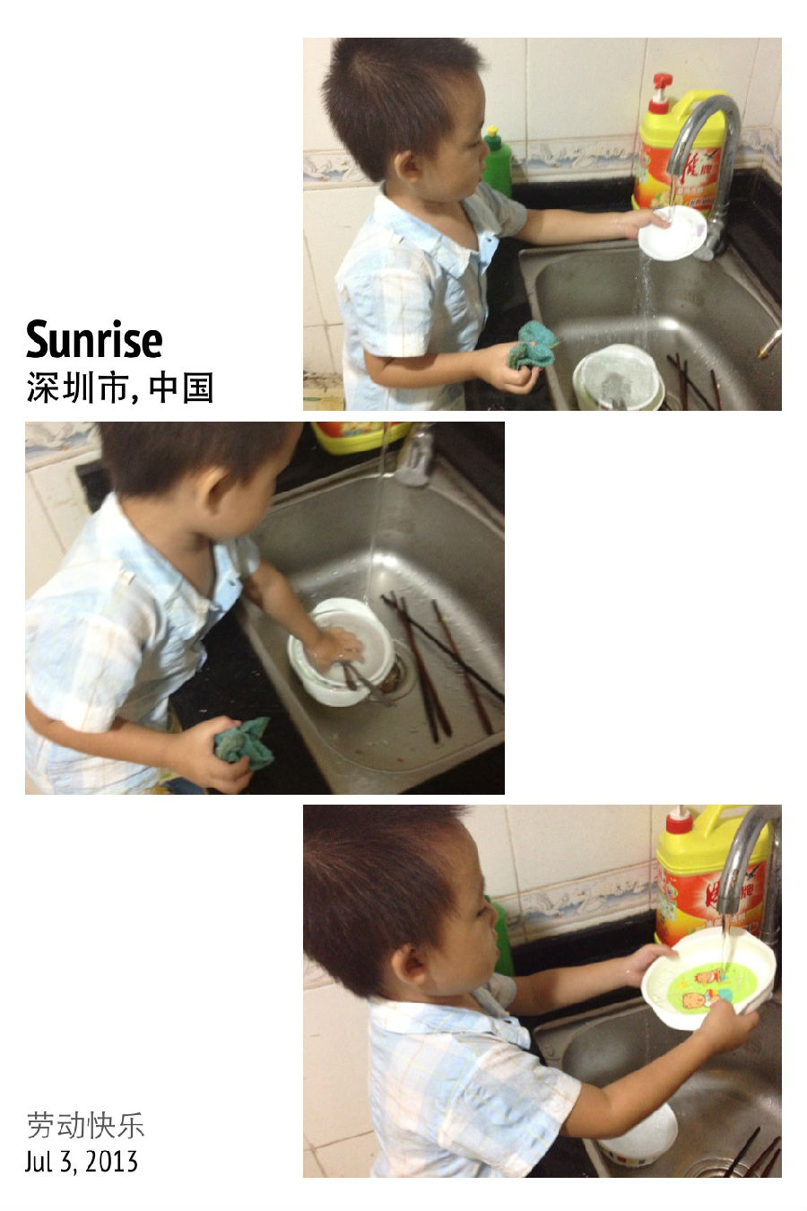 所有的劳动,我们都共同参与,威威会跟我一起买菜,饭前会帮我淘米或者洗菜,吃饭前会帮忙把碗筷摆好,自己爬到自己的餐椅上去,吃完饭会帮忙擦桌子和洗碗。他不再是一个需要别人围着他转的“中心点”,而真正成为了家里的一份子,可以做出自己积极贡献的一份子。