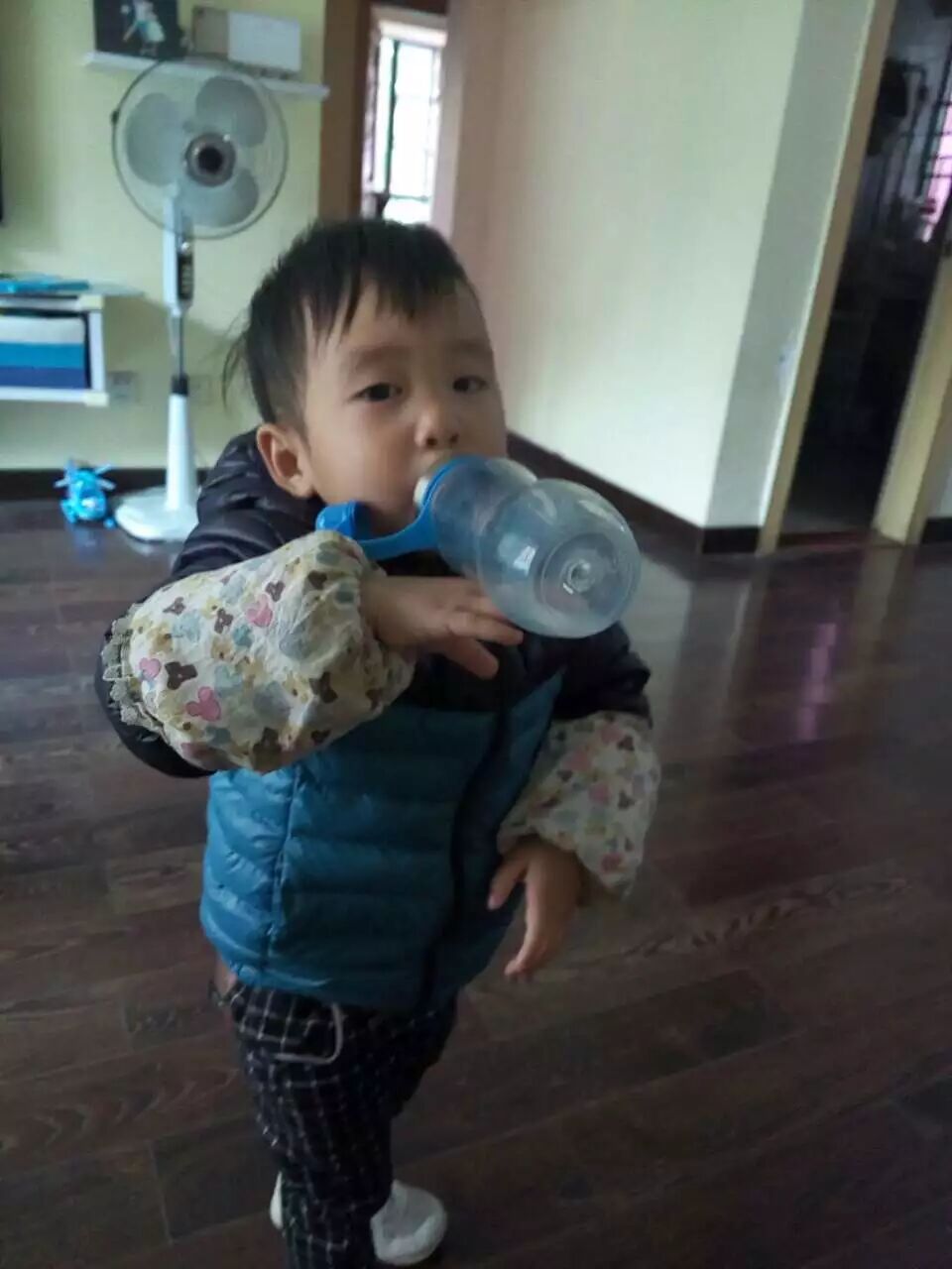 今早,我给仔仔冲好牛奶让他自己喝,我到厨房舀粥,转身出来看见地上居然好多洒出来的牛奶,再看那小子,居然双手不扶着奶瓶,任由瓶子倒立在自己的嘴里,总之,就是——在玩!