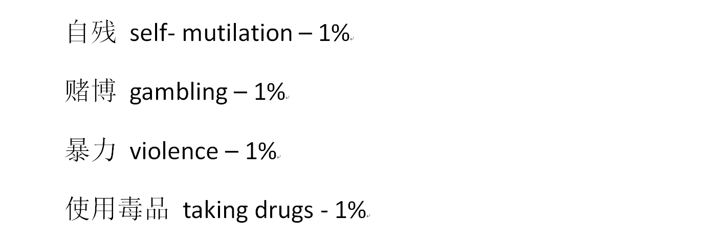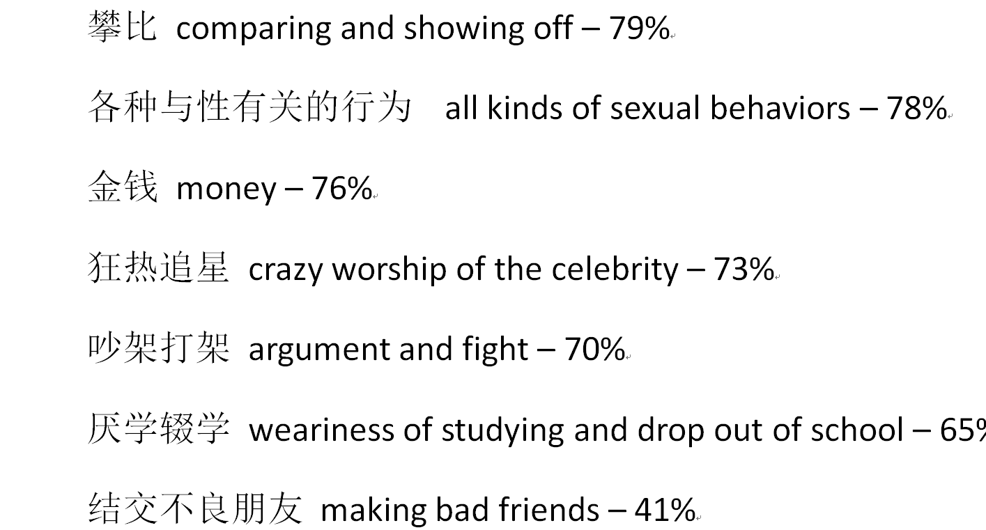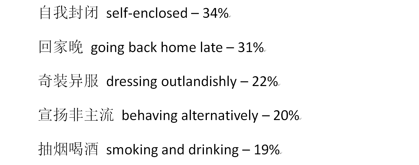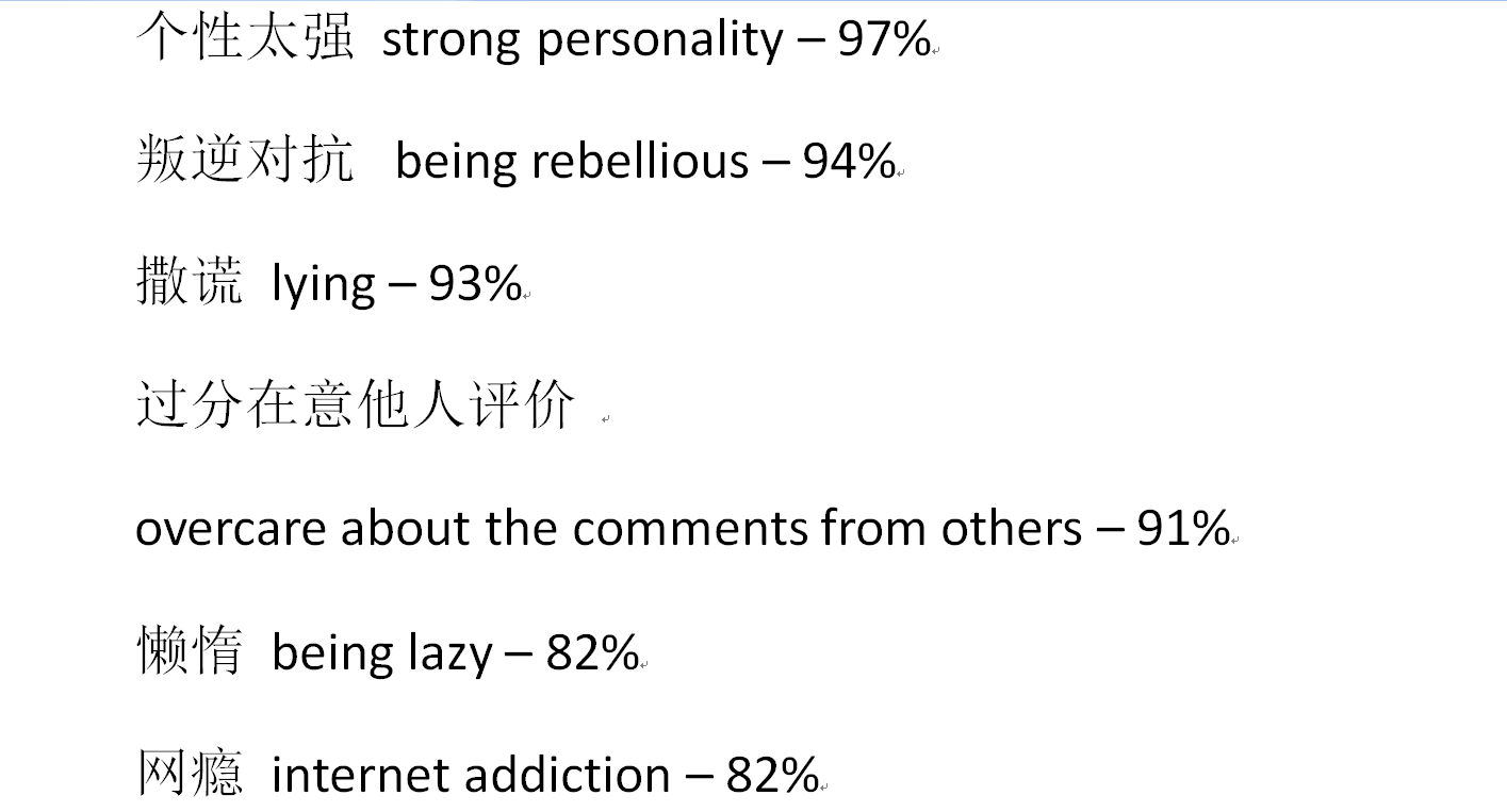 与美国青春期孩子挑战的一个显著不同为:不安全驾驶汽车、饮酒/酗酒、使用麻醉品/毒品、暴力,这四个在美国青春期孩子中排名非常靠前的挑战,在此次针对中国成年人/家长的调查中,排名非常靠后。