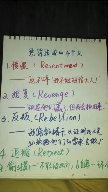 我们也可以想一下我们小时候或者我们的孩子如果承担这样的后果清单,会不会像刚才惩罚造成的4个R那样,会愤恨,报复,反叛,退缩,当然也可能会讨好,变成一个乖孩子。