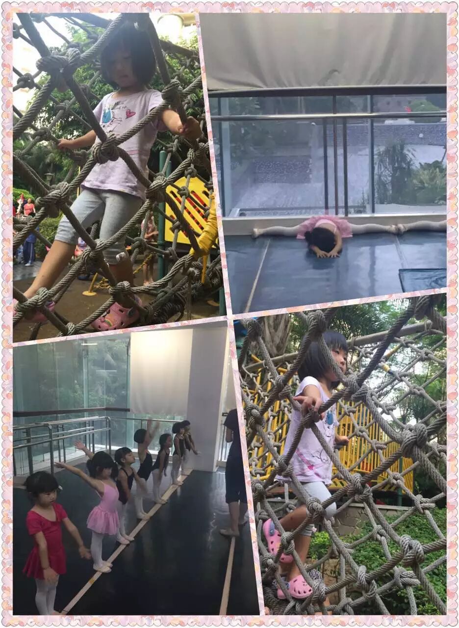 偷偷看她们,感觉又长大了,有勇气有坚持。两张照片是隔着玻璃门拍姐姐上舞蹈课,另两张是朵拉今天第一次自己过绳索桥。