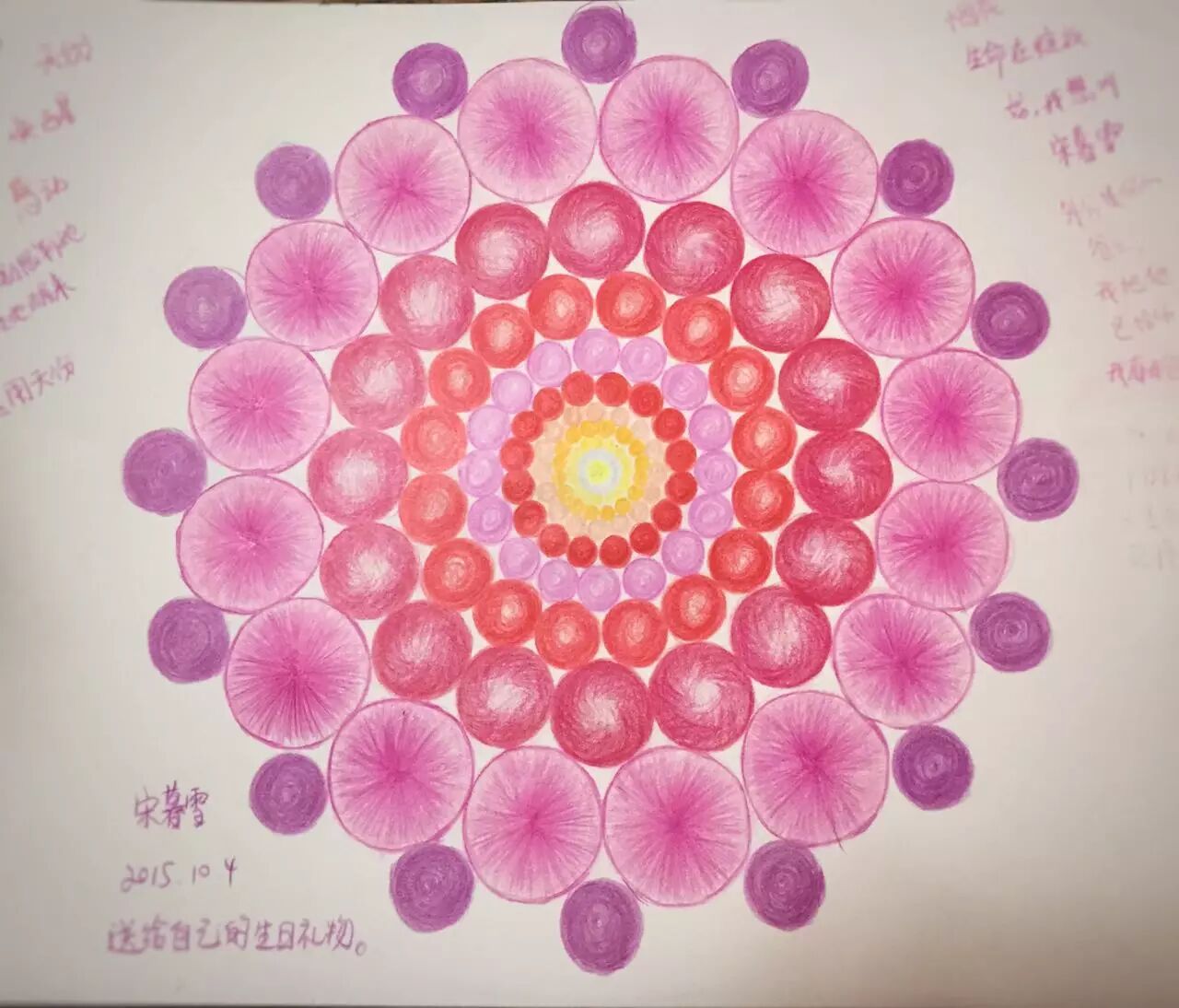1、还有23小时,是我32岁生日。送给自己一份生日大礼,三个半小时画完的一副曼陀罗,162个圆。最初的意向是最近在看三体,感慨生命。在画到倒数第三圈时,就深入到我自己的个案,162个圆,10圈,每一圈都用不同的方式描绘着,我的心越来越定,感觉不到时间的流逝,有一些声音就那样从内心深处冒出来。嘿,你好。