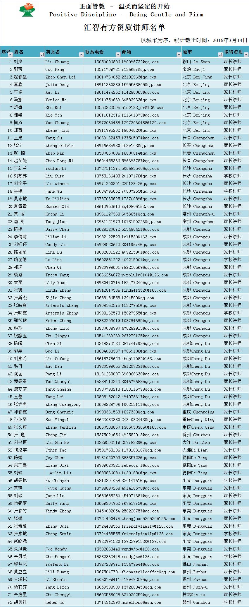 以下是2013年12月至今,通过“汇智有方-正面管教”讲师班取得资质的校友录。您还可以在汇智有方的网站上看到这份校友录:www.pd-china.org。今后我们还将继续增加每一期讲师班的名单。