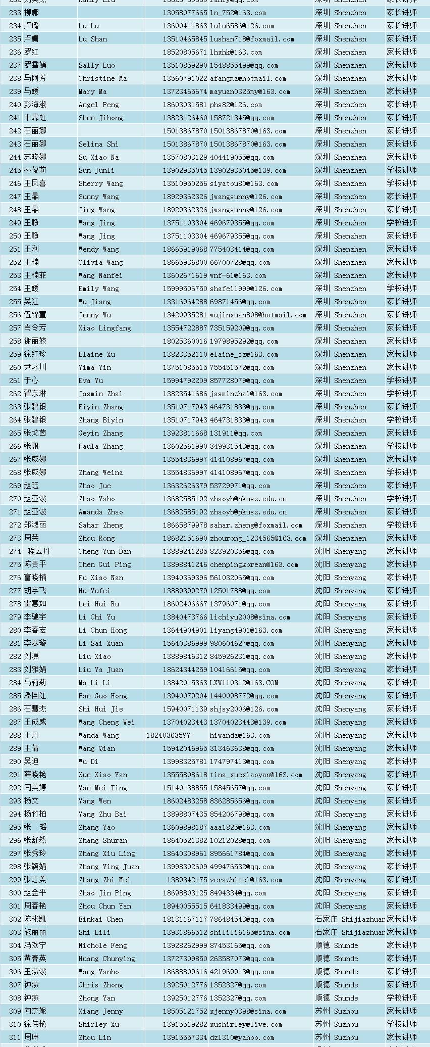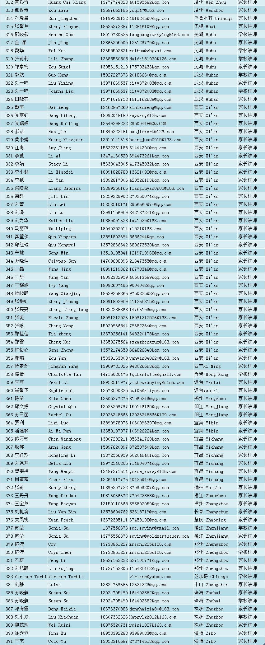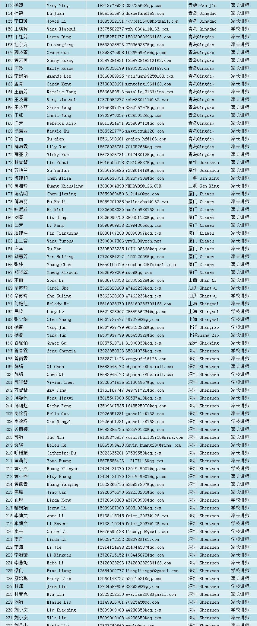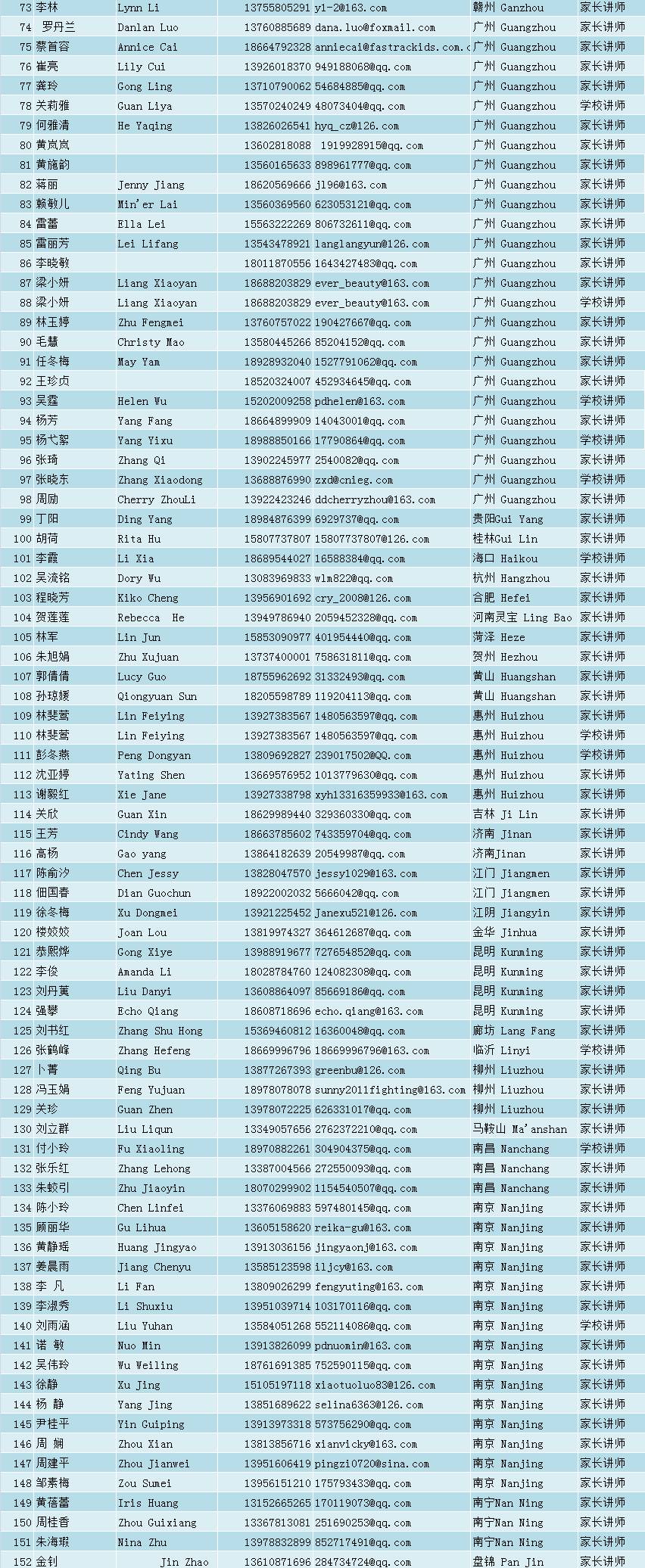 本次名单更新,新增2015年10月深圳家长讲师班和2015年12月西安家长讲师班资质讲师,导师为李丛。