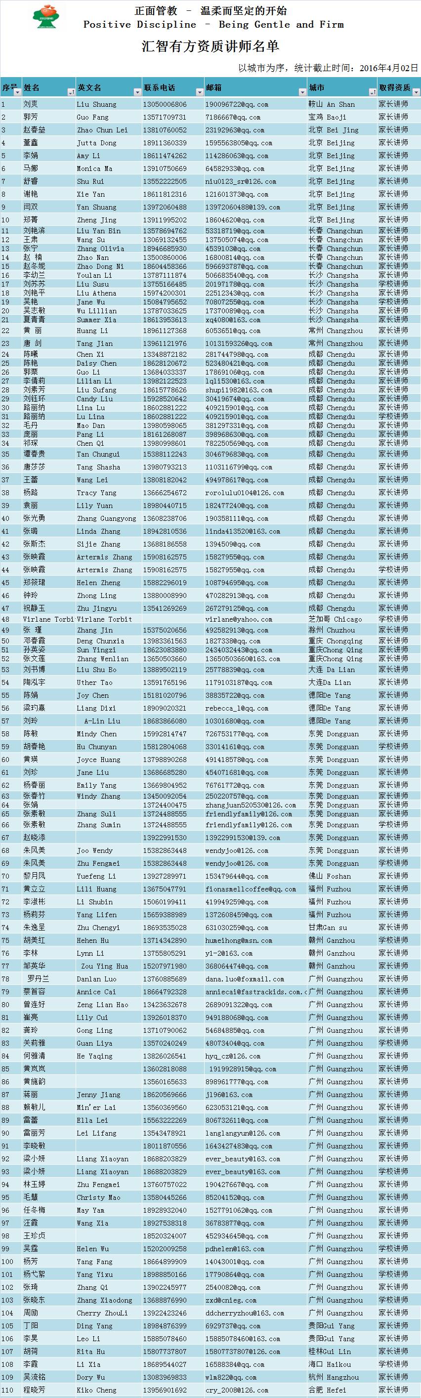 以下是2013年12月至今,通过“汇智有方-正面管教”讲师班取得资质的校友录。您还可以在汇智有方的网站上看到这份校友录:www.pd-china.org。今后我们还将继续增加每一期讲师班的名单。