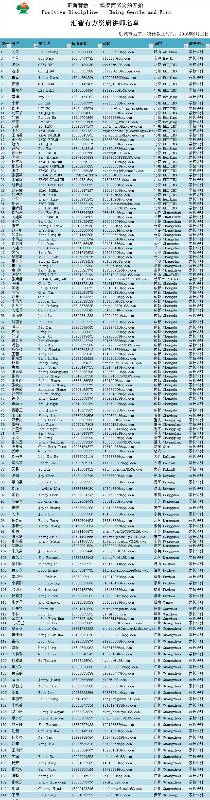 以下是2013年12月至今,通过“汇智有方-正面管教”讲师班取得资质的校友录。您还可以在汇智有方的网站上看到这份校友录:www.pd-china.org。今后我们还将继续增加每一期讲师班的名单。
