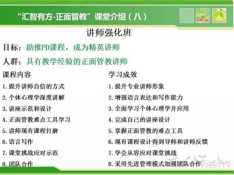 “正面管教”体系基于“个体心理学”理论,四十年前创建于美国。正面管教课程有针对家长的、针对教师的,针对心理治疗师的,它教大人怎么有效健康地对待孩子,是针对成人的性格教育。