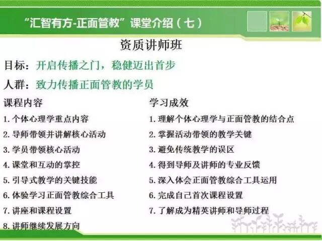 (5) 完成“汇智有方”家长班两个阶段并符合报名条件的学员,报名资质讲师班时优先考虑。