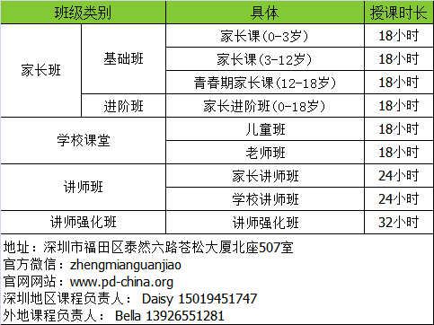 5、一月家长课进阶班(深圳集中班) 时间:1月20日、21日、22日 (上午:9:30-12:30;下午:13:30-16:30) 频率:连续三天 全天 地点:深圳市福田区泰然六路苍松大厦北座507室 讲师:张戈茵(导师) 联系人:Daisy——150 1945 1747