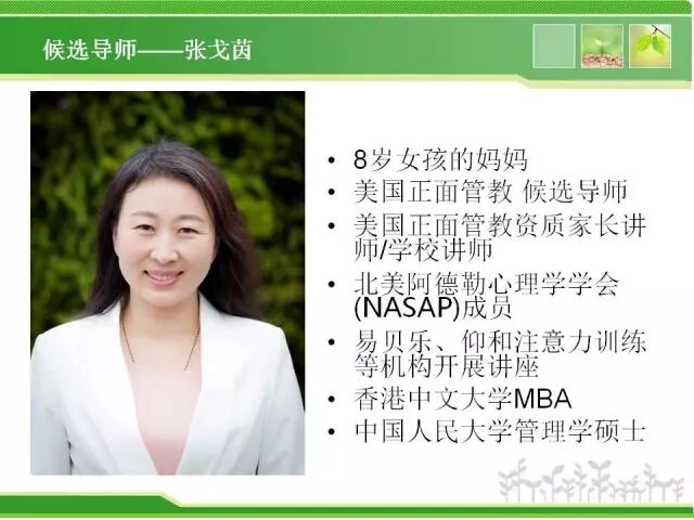 2、十月家长课进阶班(深圳班) 时间:10月13日、20日、27日 (周四)(上午:9:30-12:30;下午:13:30-16:30) 频率:连续三周 每周四全天 地点:深圳市福田区泰然六路苍松大厦北座507室 讲师:张戈茵(导师) 联系人:Daisy——150 1945 1747