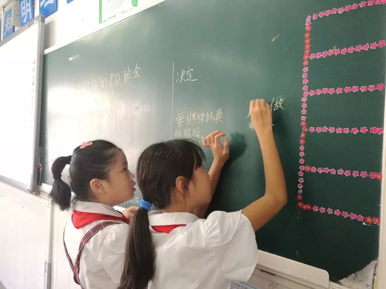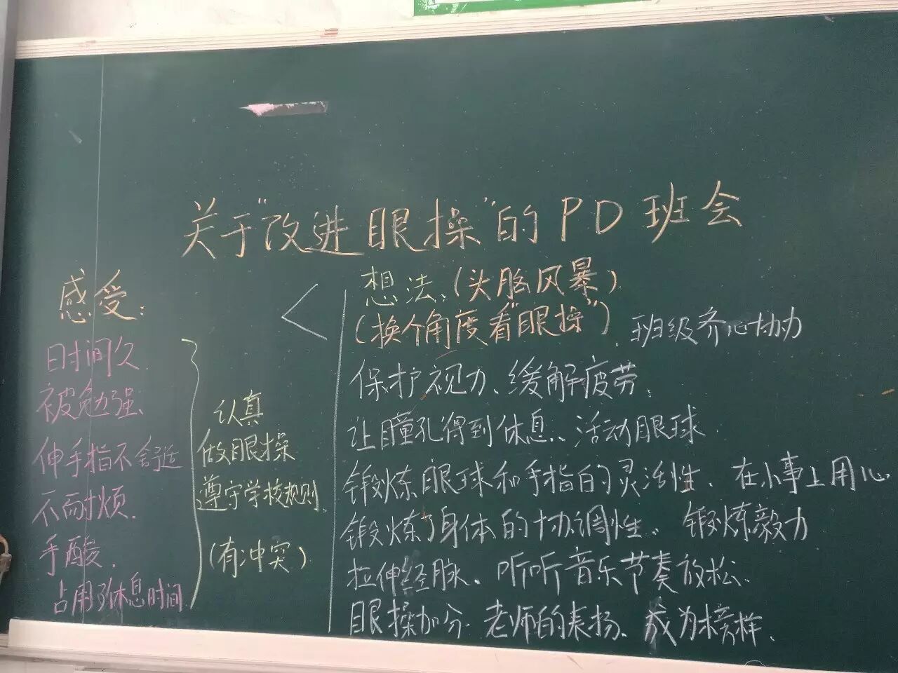 今天早上,我和孩子们开展了一场关于“认真做眼保健操”的PD班会(班级学生做眼操的积极性不高,并时不时出现被扣分现象)。