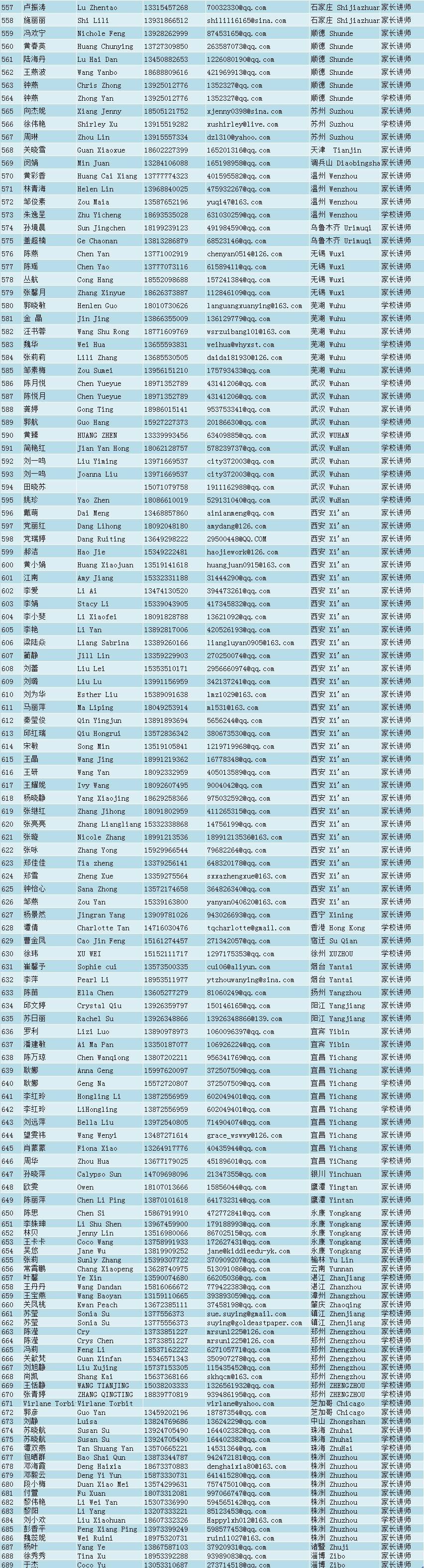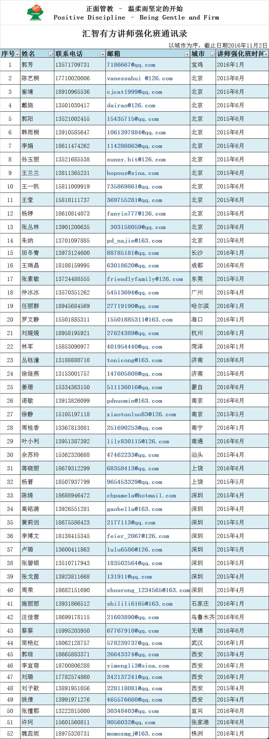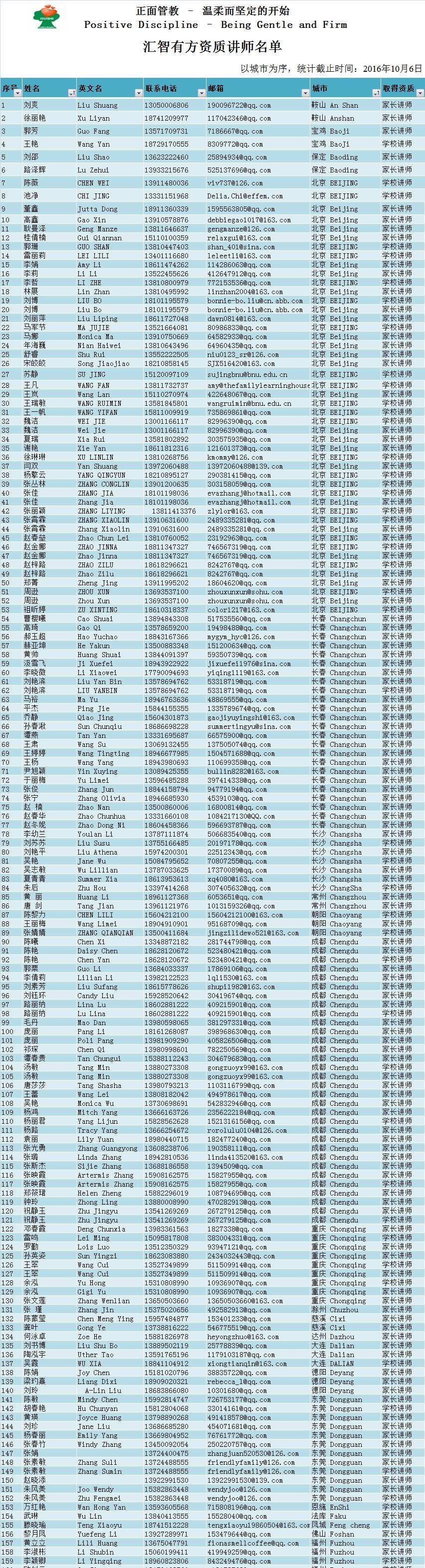 以下是2013年12月至今,通过“汇智有方-正面管教”讲师班取得资质的校友录。您还可以在汇智有方的网站上看到这份校友录:www.pd-china.org。今后我们还将继续增加每一期讲师班的名单。