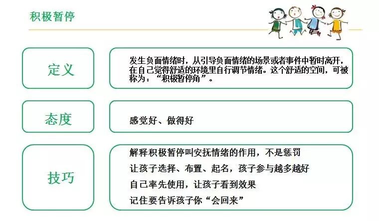 任何感觉不好的时候都可以使用积极暂停角来应对孩子的负面情绪,处理自己的负面情绪。