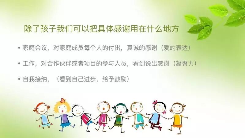 那我们现在,来想一想具体的感谢给出我们能够对待孩子给孩子更多的鼓励,我们还可以把具体感谢用在什么地方。