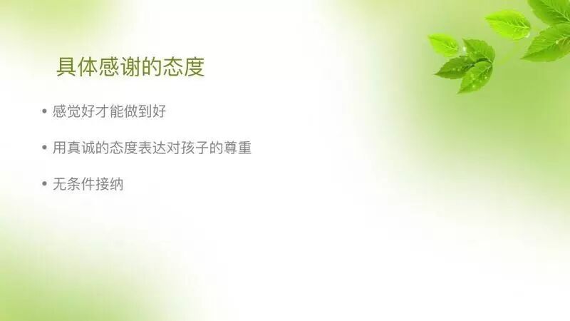 第三个态度,无条件的接纳,我们怎样才能让孩子感受到我们对他的感谢是真诚的是发自内心的尊重他的。