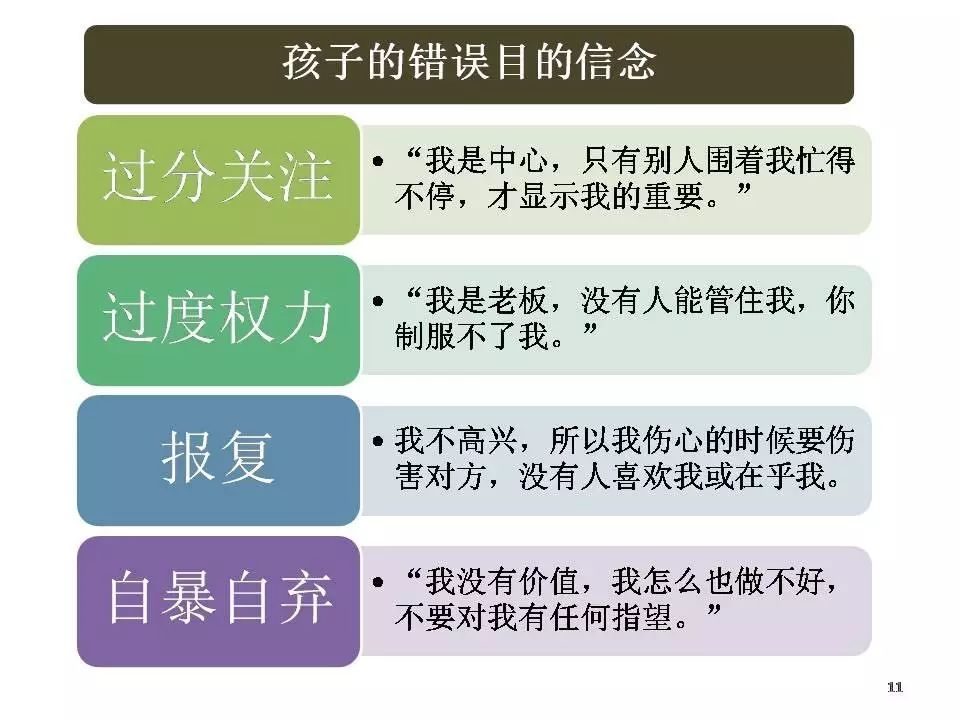 上面这个图就是大家(大部分人)都很熟悉的四个错误目的,就是当孩子非常灰心、非常沮丧的时候,他可能就会对如何获得价值感和归属感,会产生上面这四种错误的信念,然后他就会做出一些不当的行为。
