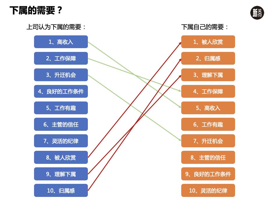 你可以看到图的左边是很多管理者自认为激励下属最有效的方法,比如最重要的是给予下属高收入、晋升机会等,但这些管理者并没有想到的是,恰恰图的右边才是下属自己对如何有效激励的重要性排序,你发现,下属最需要的前3项是“被人欣赏、有归属感、能理解下属”,而收入的重要性仅排在第5个。领导者必须塑造团队的内驱力,否则很难长久激发下属的工作动力。