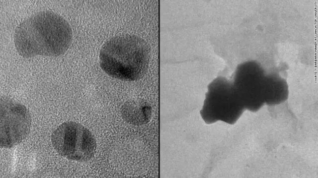 一种粒子的形态是有棱角的或者锯齿状的,在人脑中自然形成。而另一种粒子呈球形,这是因为它们是在高温中形成,比如汽车发动机中,而且其中包含了一些其它金属,比如铂和镍。研究者认为,后者的尺寸、质地、成分和形状均与众不同,这说明了它来自于外界污染物。