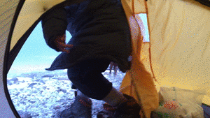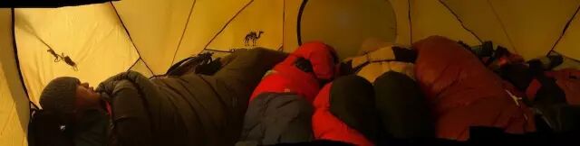 这次玉珠峰攀登,由于天气异常恶劣,关雅荻和我仅用手持Gopro记录了几个简单的冲顶视频。当时在海拔5600米的C1营地,5个人挤在一个帐篷里,叠罗汉的睡姿。