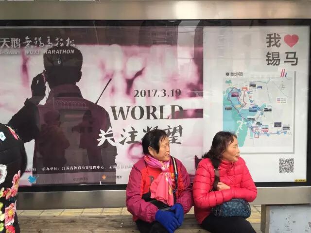 2017年3月14日,距离无锡马拉松还有5天,在滨湖区蠡溪路各处公交站牌的广告位上,已被无锡马拉松的宣传海报占满,海报上是身穿黄色马甲的工作人员,正在打电话,背对着镜头,边上写着“关注凝望”四个字。无锡马拉松已经进入最后冲刺状态。