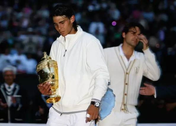 但当事人在当时的情境,好像并未设想过这将是场伟大的比赛。费天王心不在焉的丢掉前两盘,各种低级失误,连BBC解说员都对此唉声叹气,觉得费天王有失水准。直到第三盘,“草地之王”才缓过劲儿,连扳两盘。最后决胜盘,纳达尔以9比7的优势战胜费天王,捧得温网冠军奖杯,也把费天王从世界第一的位置上拽了下来。