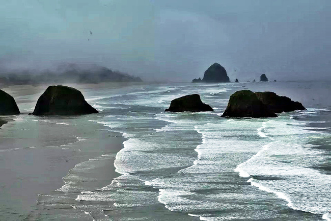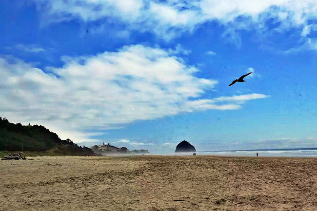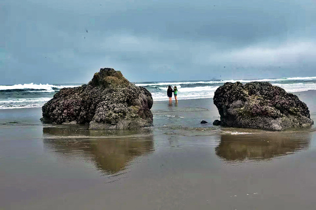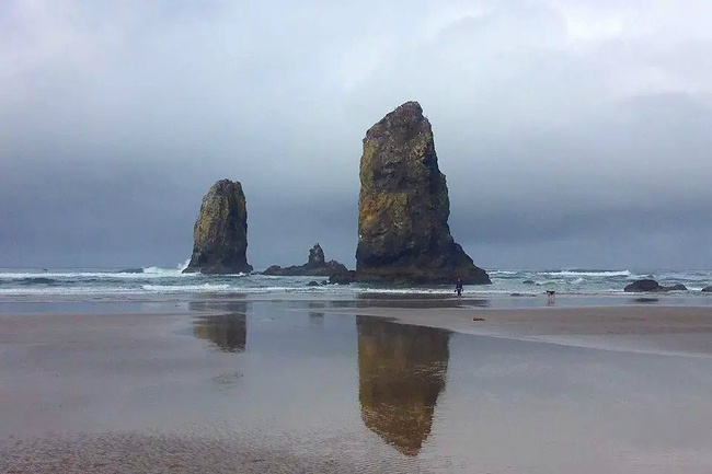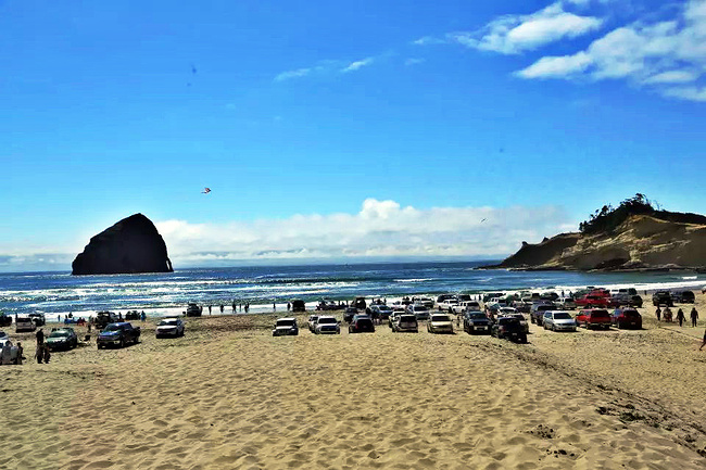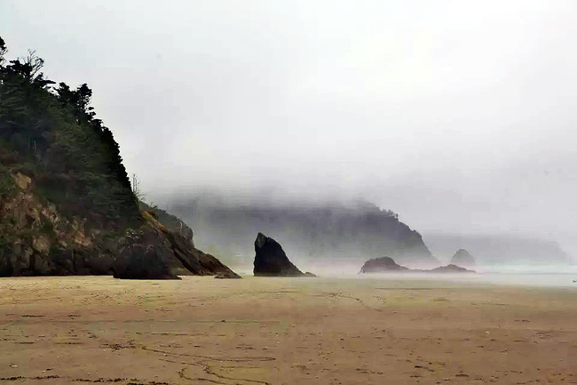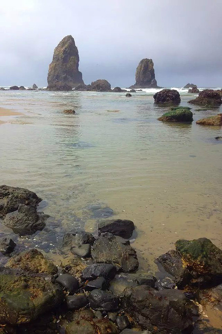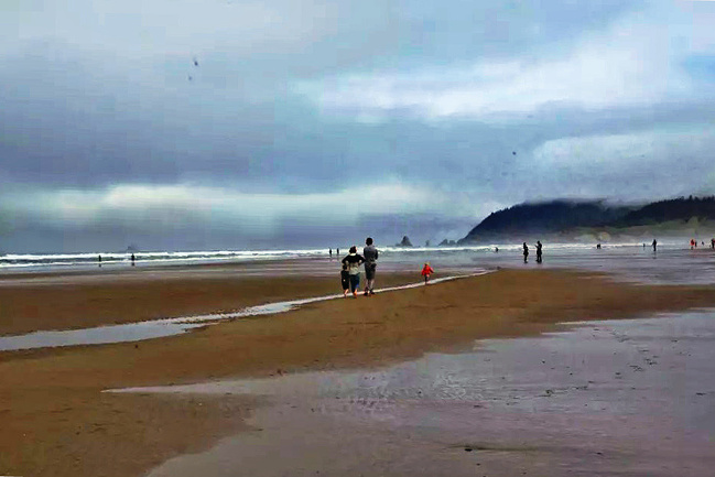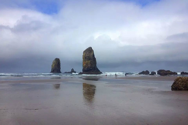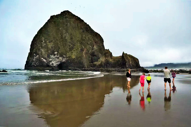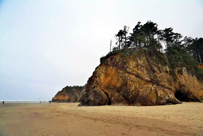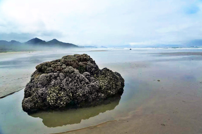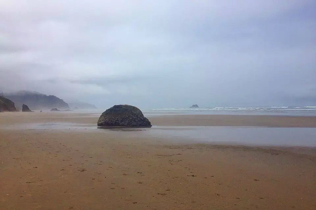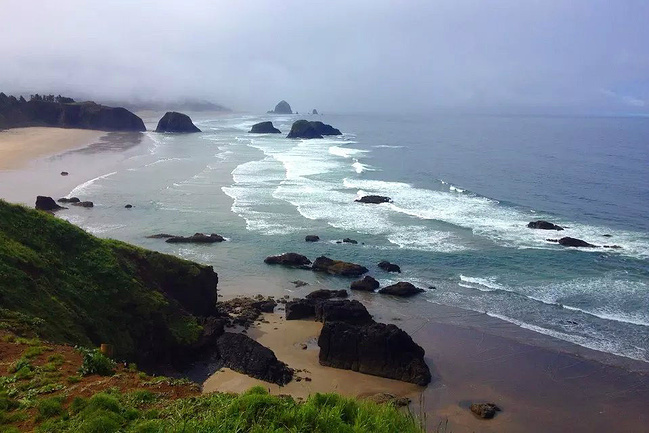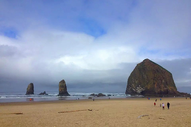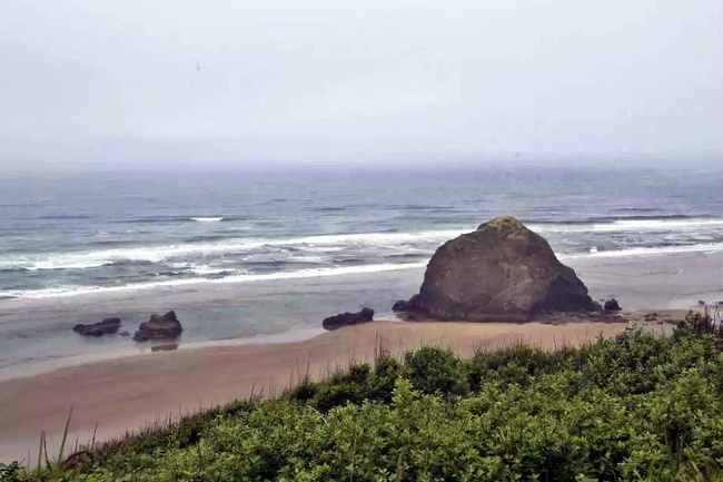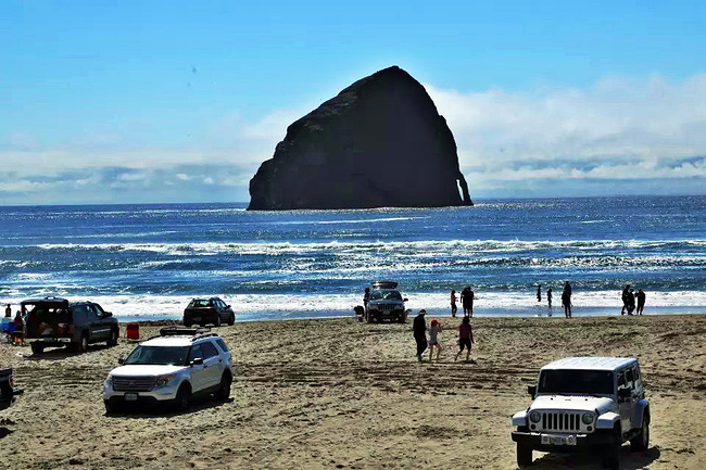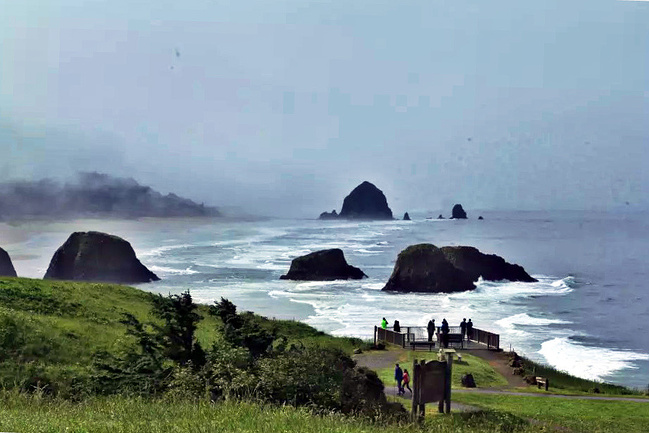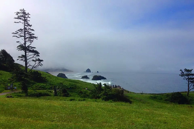 我们的行程路线是沿着101号公路海岸线由北往南。从华盛顿州101号公路南下越过跨海大桥就是俄勒冈州,这里是哥伦比亚河的入海口。西北角坐落着海港古镇阿斯托里亚,继续前行40公里就是我们旅行的第一站佳能海滩。佳能海滩是俄勒冈州有名的旅游小镇,整个小镇都是顺着漫长的海滩而建。小镇不大,却有五个风光迤逦的公园。我们一早首先来到的是宜客莱州立公园。公园收费5美元/车,一进入公园就被这里宽阔的绿地,挺拔的青松,美丽的海滩深深吸引住了。长达15公里的海岸线上点缀着大大小小,各式各样的礁石,在海浪和晨雾中忽隐忽现,即使阴霾天气中朦胧失色,也还是那样婀娜多姿,仍不失为一道亮丽的风景线。沙滩上海水涨退形成的潮水池形成许多有趣的图案,更增添了无穷魅力。虽然风景迷人,但游人似乎并没有沉溺于此,而是尽情享乐其中,戏水,漫步,游泳,冲浪,休闲,野餐以及去公园内5公里的森林小径徒步。总之,这里就是一个天然休闲区。