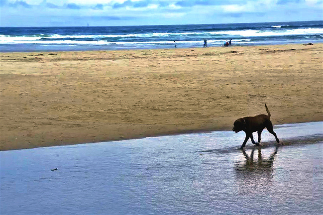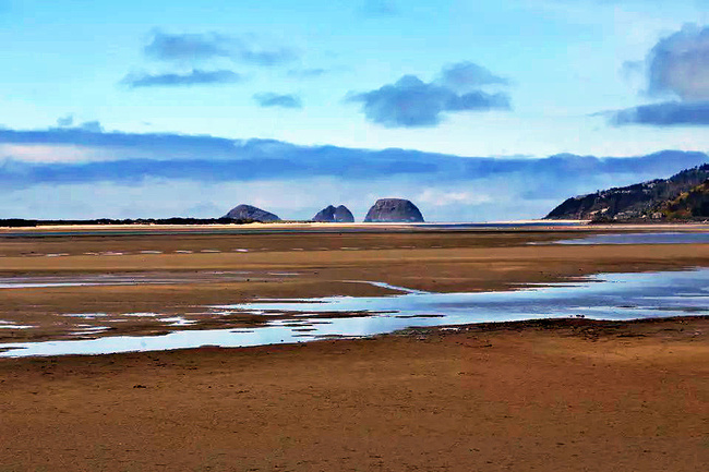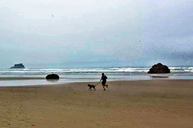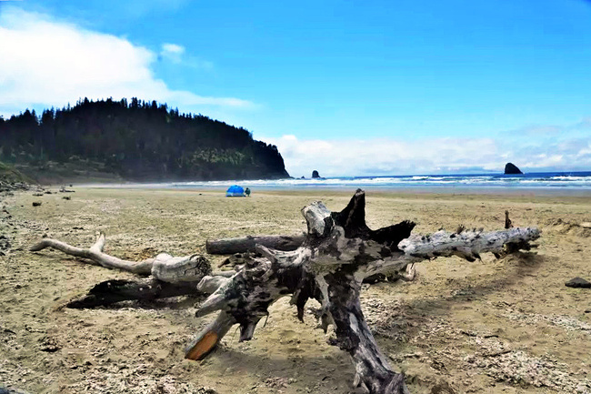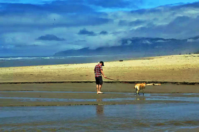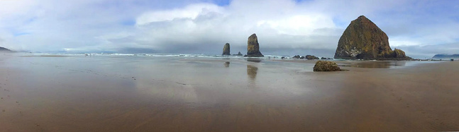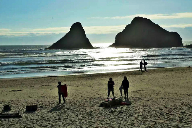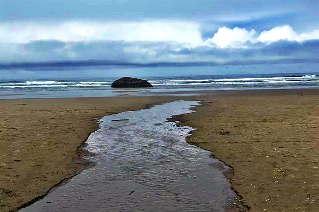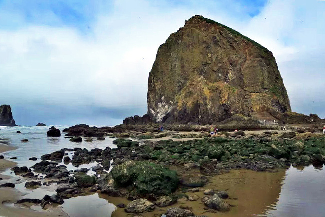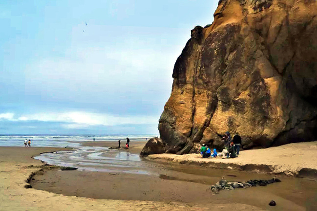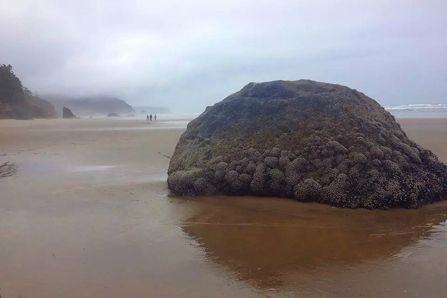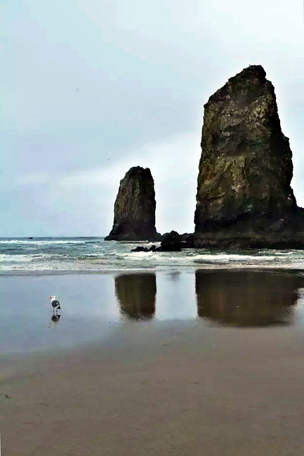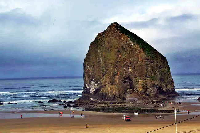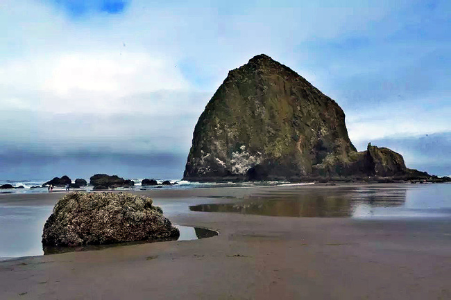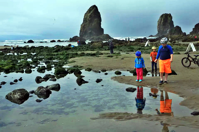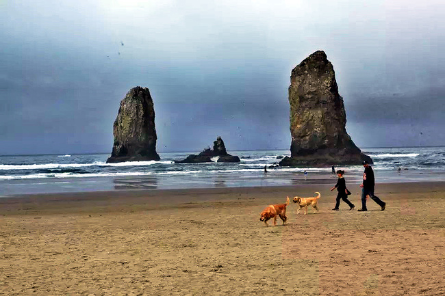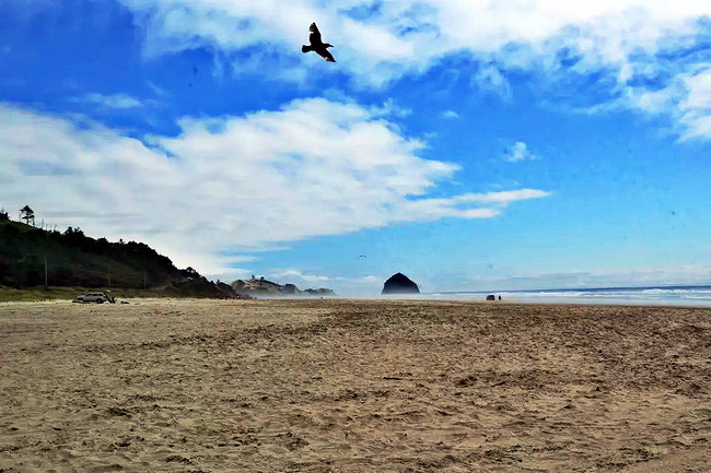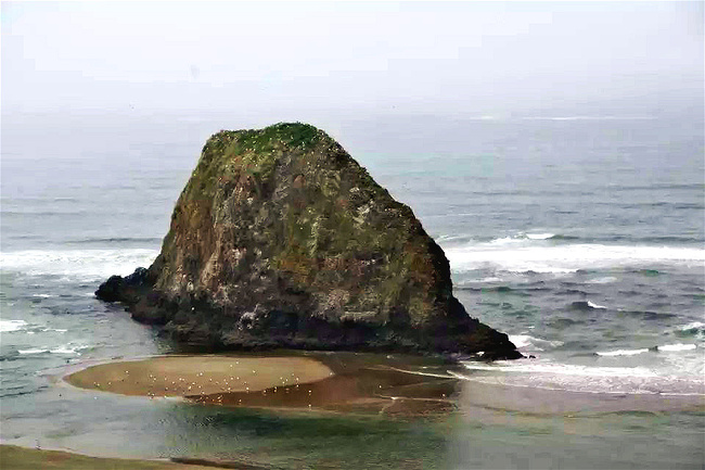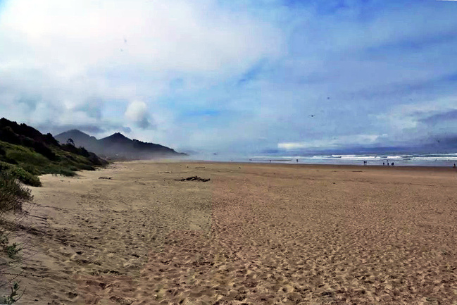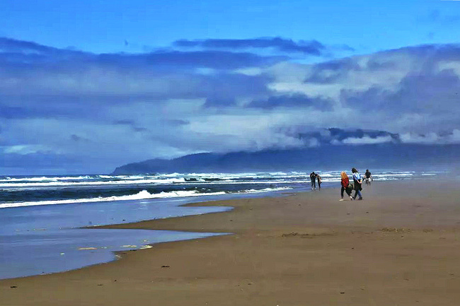 我们的行程路线是沿着101号公路海岸线由北往南。从华盛顿州101号公路南下越过跨海大桥就是俄勒冈州,这里是哥伦比亚河的入海口。西北角坐落着海港古镇阿斯托里亚,继续前行40公里就是我们旅行的第一站佳能海滩。佳能海滩是俄勒冈州有名的旅游小镇,整个小镇都是顺着漫长的海滩而建。小镇不大,却有五个风光迤逦的公园。我们一早首先来到的是宜客莱州立公园。公园收费5美元/车,一进入公园就被这里宽阔的绿地,挺拔的青松,美丽的海滩深深吸引住了。长达15公里的海岸线上点缀着大大小小,各式各样的礁石,在海浪和晨雾中忽隐忽现,即使阴霾天气中朦胧失色,也还是那样婀娜多姿,仍不失为一道亮丽的风景线。沙滩上海水涨退形成的潮水池形成许多有趣的图案,更增添了无穷魅力。虽然风景迷人,但游人似乎并没有沉溺于此,而是尽情享乐其中,戏水,漫步,游泳,冲浪,休闲,野餐以及去公园内5公里的森林小径徒步。总之,这里就是一个天然休闲区。