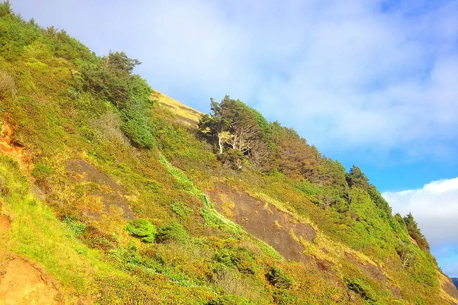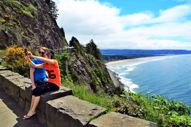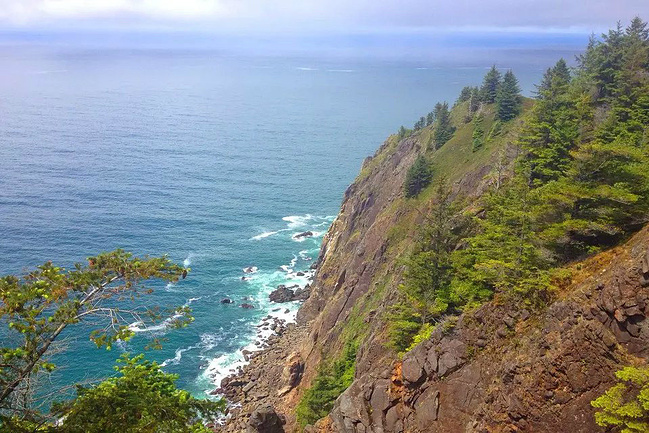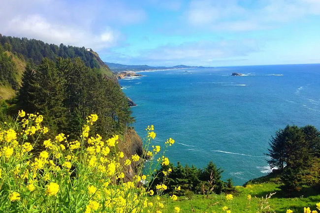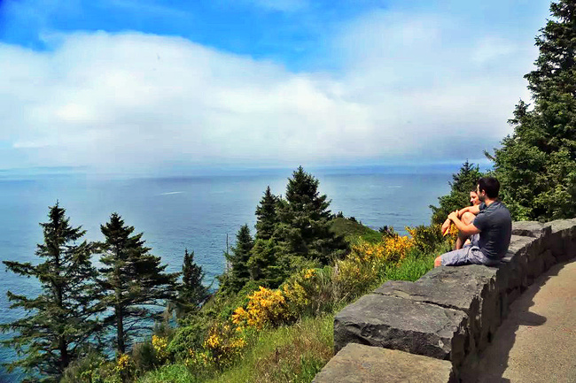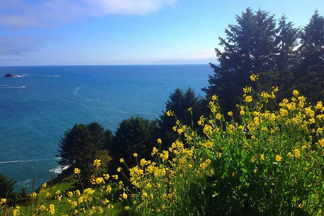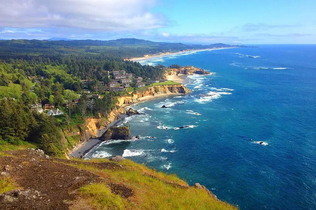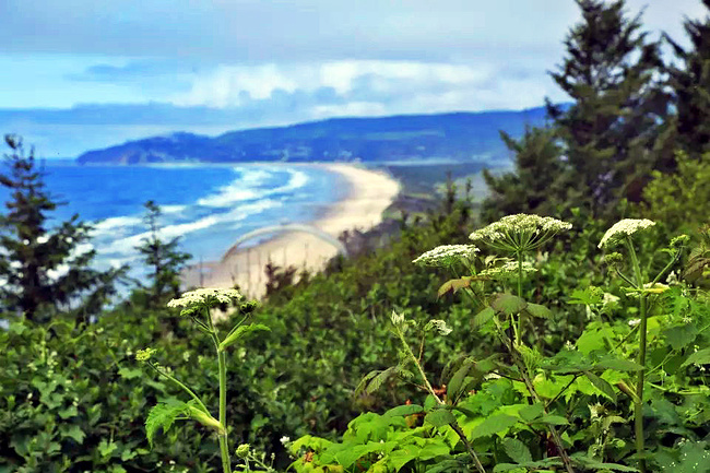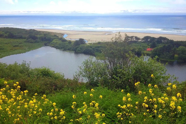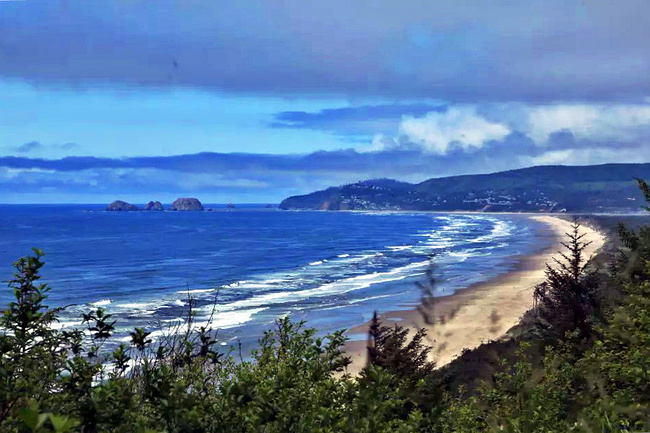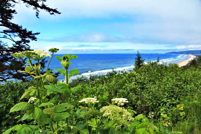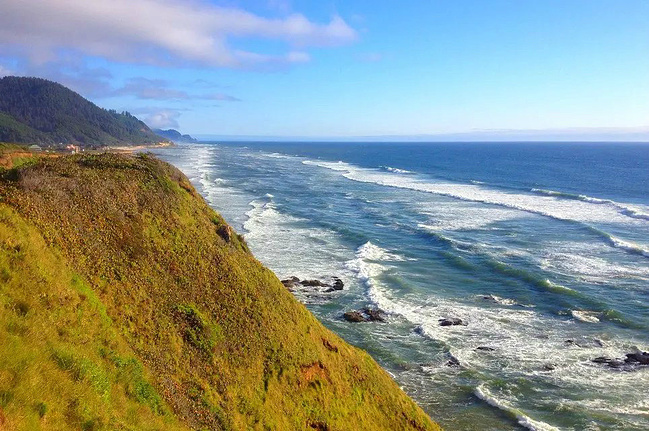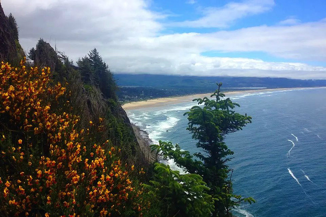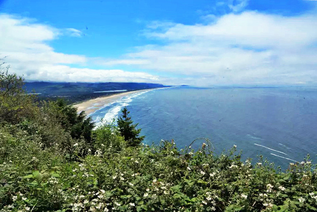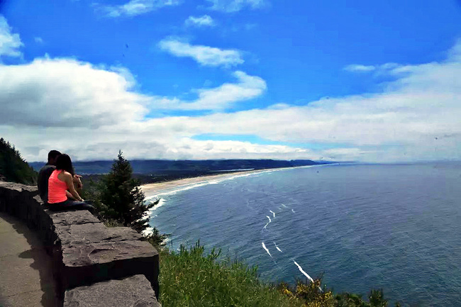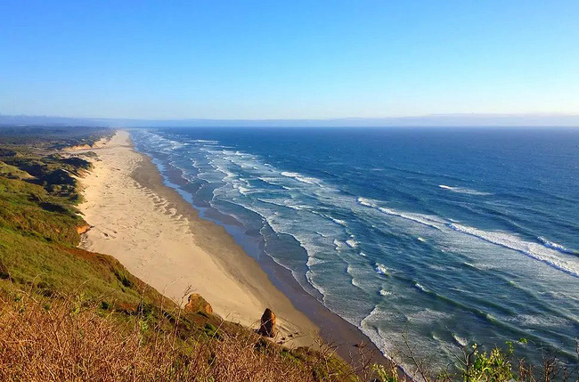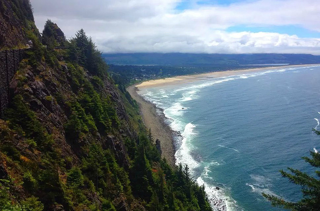 再往前行十来公里就到了奥斯瓦尔德西部州立公园,一看这里就是俄勒冈州人气最旺的公园之一,是当地人游泳,冲浪,远足和休闲好地方。它的特点是拥有两千多英亩的海岸温带雨林,公园内修有长达20公里的海岸步道供游人徒步,去到美丽幽静的沙滩都需要穿过茂密树林。我们到时偌大的停车场满满当当,连路旁都停满了车。我们选择就近停在101号公路旁边的莱亚卡尼观景台,这里同样属于公园区。旁边也有小径分别通向海湾和山上。听刚爬完山的人介绍,上山的小径虽然非常陡峭和狭窄,但上面的风景美极了,如果有时间去爬山绝对值得。我想所言非虚,因为此刻我们所站的地方就是百丈悬崖之上,从这里俯瞰,延绵的沿岸山脉,宽阔的尼黑勒姆海湾,远处的曼扎尼塔小镇,全部尽收眼底。你会发现自己早已置身在一幅绝美的画卷之中。仅此观景处,已然是整条101风景路上最美的一个景点了。