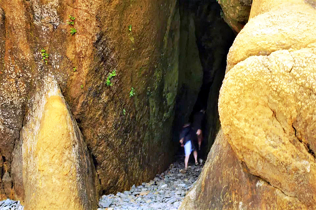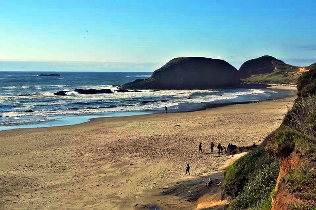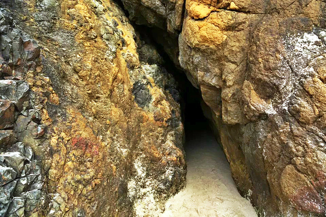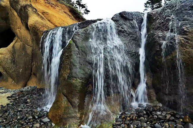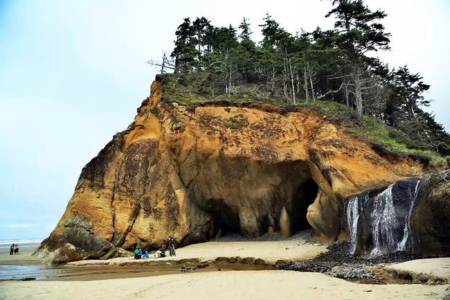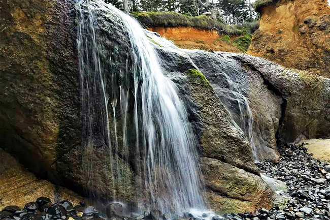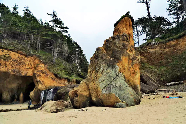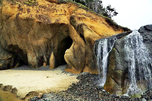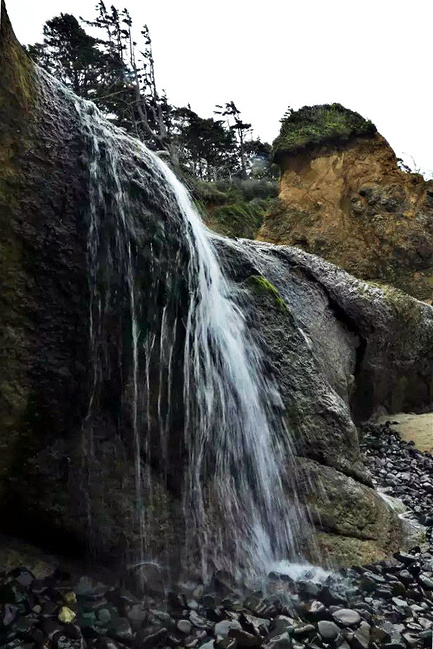 拥抱角海滩给了我们最大的惊喜。它与阿卡迪亚海滩只隔着山脚,两个海岬退潮时可以步行通过。这完全是个路过绝对不能错过的地方。穿过小树林,踏上细沙滩,眼前是宽阔的海滩,高耸的悬崖 ,海蚀洞,潮水池,礁石,海浪,更有从层叠的岩石上飞流直下沙滩直奔太平洋的瀑布——真是还有什么会比这更令人陶醉?它简直就是一颗隐藏于西海岸的明珠。如此神奇而美丽的景象不身临其境很难想象,我很庆幸自己误打误撞进到公园,如果仅靠网上搜寻十之八九就错过了。退潮的时候应该是这里的最佳游览时间,不仅可以趁着退潮欣赏到潮池中种类繁多的海葵,海星和其他海洋生物,还可以涉过浅滩去到充满神秘感的沿岸悬崖下面的洞穴探索。令人奇怪的是,这么好的公园并没有什么显眼的大门或标示,只有一个被路边的小森林所遮住的停车场入口,稍不留神很容易失之交臂。
