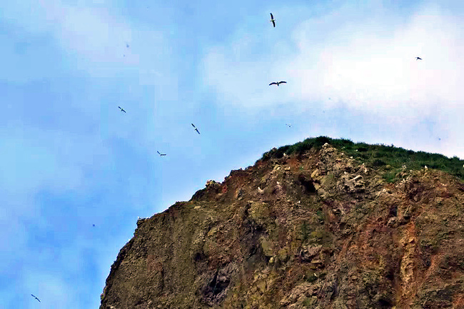接着旁边就是干草堆岩石,它无疑是佳能海滩最出名的景点,甚至于比佳能海滩本身还出名。它是佳能海滩的地标,也是所有同名同姓叫干草堆岩石这个名字中公认最有名的。这个高72米的火成岩山据说是世界上第三高的潮夕岛。它显然是火山活动的杰作,整体从海岸山脉中抛离到大海,可是它似乎又不甘于远离大陆,于是乎立定海边隔着宽阔的沙滩与陆地若即若离,久而久之在它周边形成了一个独立的潮间地带,而它好像真的在此找到了归宿似的,脚下潮池生活着许多潮间带动物,包括海星,海葵,螃蟹,石鳖,帽贝和海蛞蝓等,岩石本身则成为燕鸥和海雀等海鸟们的巢穴,旁边还有三个较小的岩石柱相随相伴。神奇的岛礁,柔软的沙滩,飞翔的海鸥,变幻的天空,真是好一派海阔凭鱼跃,天高任鸟飞的生态和谐气象,如此自然美景自当成为艺术家和摄影师的捕捉对象,不少艺术品和好莱坞电影中都经常看到它的形象也就不足为奇了。