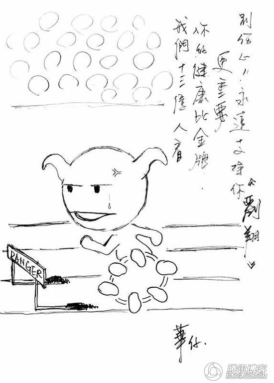 刘德华的画上写道:“我们十三亿人,看你的健康,比看你的金牌更重要。别伤心,永远支持你--刘翔!”