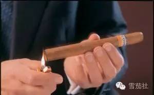 点燃雪茄需要时间与耐心来掌握,首先用左手的拇指握住雪茄上方,另外四个手指轻托雪茄,然后轻轻转动,打火机的火焰均匀地接触雪茄燃火面,当雪茄燃火面充分燃烧,圆周出现一圈细窄的黑边时,雪茄就被点燃了。http://si1.go2yd.com/get-image/0Df9AsZQTey