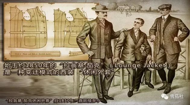 关于西服的起源众说纷纭,有一个版本特别有趣:现代西服,最初被称之为“诞生于休息室的服装”。维多利亚时期的英国上层社会,有许多礼仪讲究,特别是夜里的社交活动,男士必须穿燕尾服(英国古典礼服的一种),需举止文雅、谈吐不俗。晚宴过后,男士们可以聚在餐厅旁的休息室小憩,只有在这里,才可以抽雪茄、叼着烟斗喝白兰地、开玩笑,也可以在沙发上躺卧,这时那笔挺的紧包身体的礼服就显得不合时宜。于是,一种宽松的无尾上衣和裤子就悄然诞生了,在1853年,这种现代西服的前身被称为拉翁基茄克(Lounge jacket)。