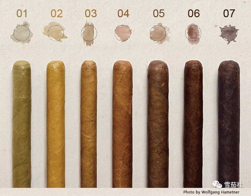 虽然雪茄制造商区分茄衣的仔细程度可多达几十个细微差别,不过,通常它们都是通过七个类别来区分,茄衣的名称以它们的种植方式,收成方式或原产国来命名,颜色可以根据深浅来分辨: