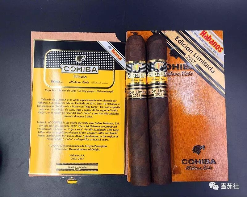 高希霸护身符2017年限量拥有超级豪华的尺寸,54环径,6.1英寸(154mm)长,每一盒只有十支雪茄。用于卷制护身符雪茄的烟叶,都是陈年至少两年,通过艾尔-拉奎托雪茄工厂的专业技师打造而成。